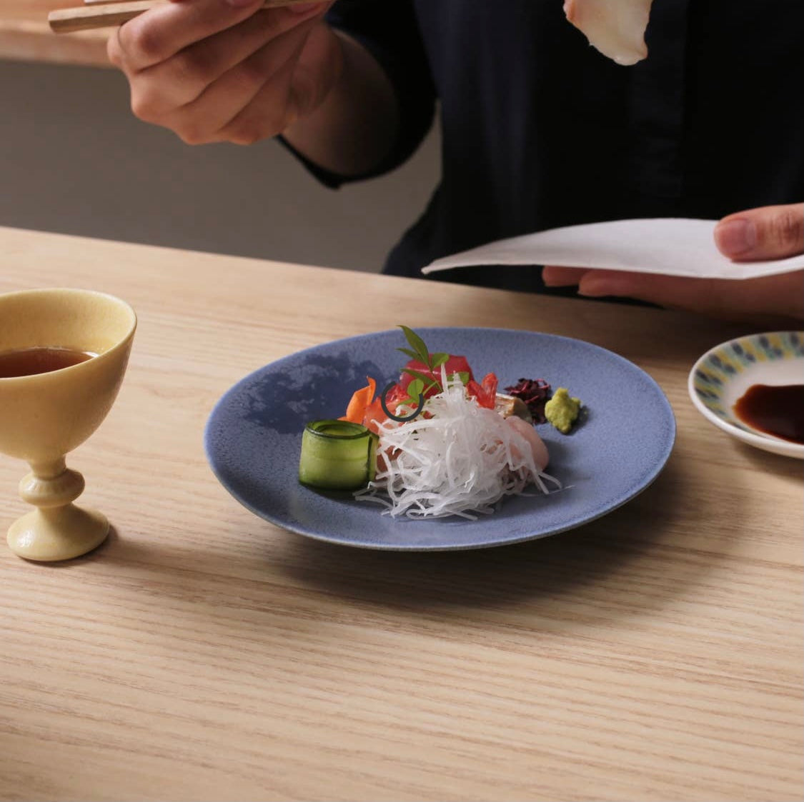 The Glanta Plate is characterized by a surface texture that can be described as both matte and glossy. The gradation is created by spraying different glazes in blue. The plates are created individually, come in irregularly shaped soft forms,It is characterized by a slightly lowered shape in the middle to allow for a more elegant presentation when serving.
