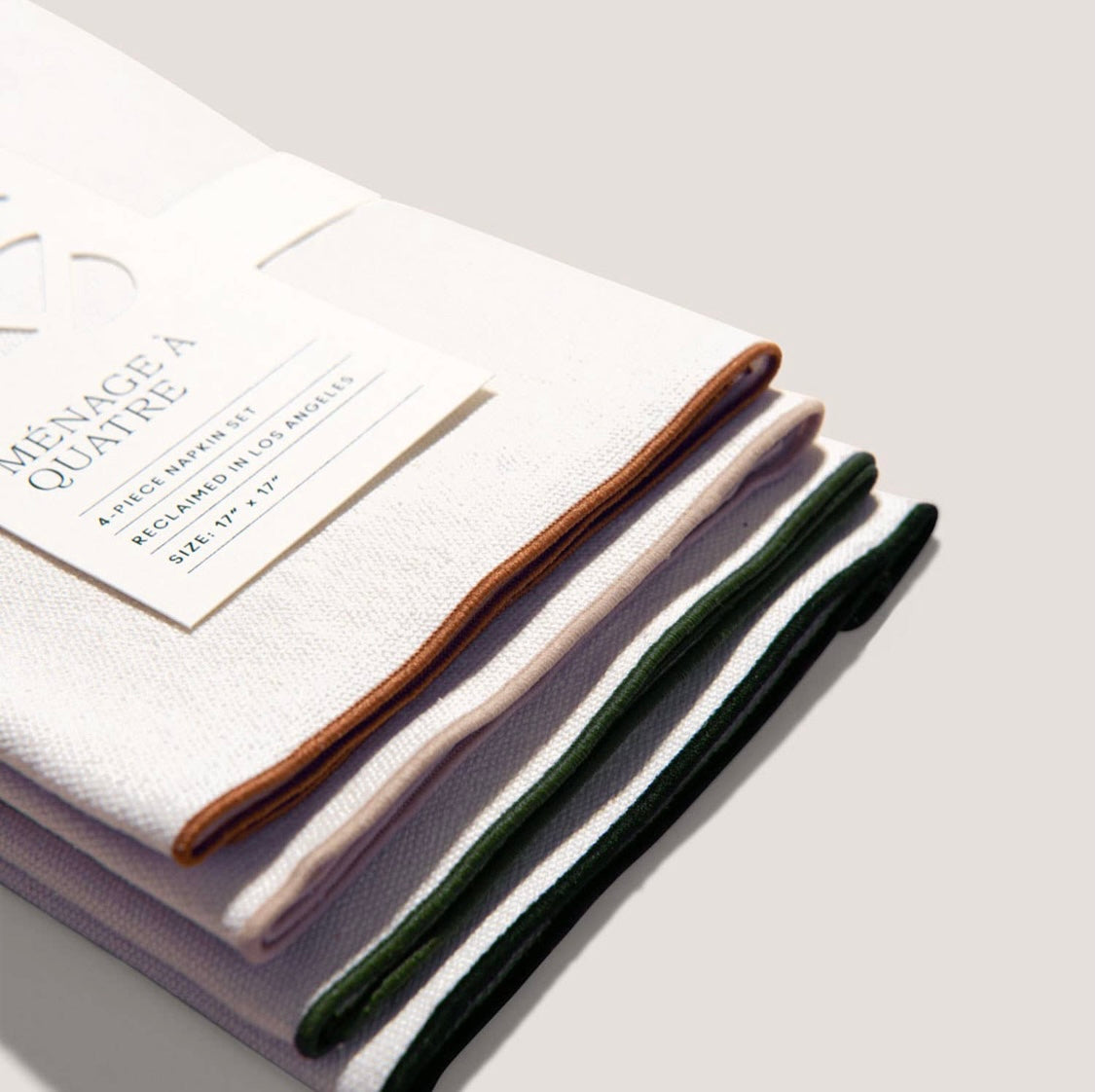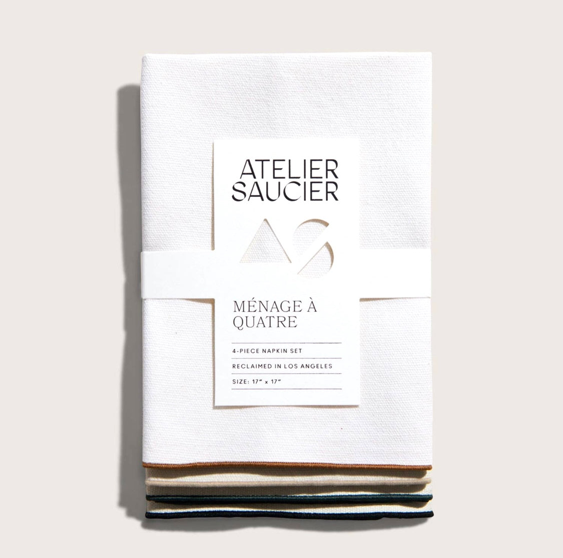 Atelier Saucer's copper, evergreen, sand and the night sky meet as a fearless foursome. Cream burlap linens get the desert the desert treatment. 4-piece napkin set. Made in Los Angeles. 100% premium reclaimed fabric.