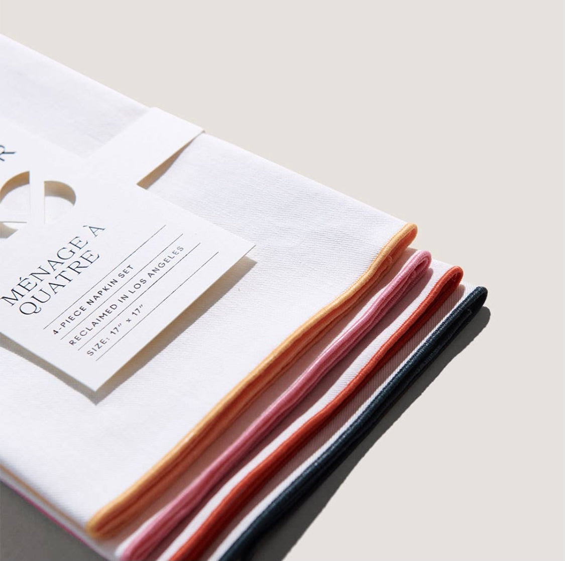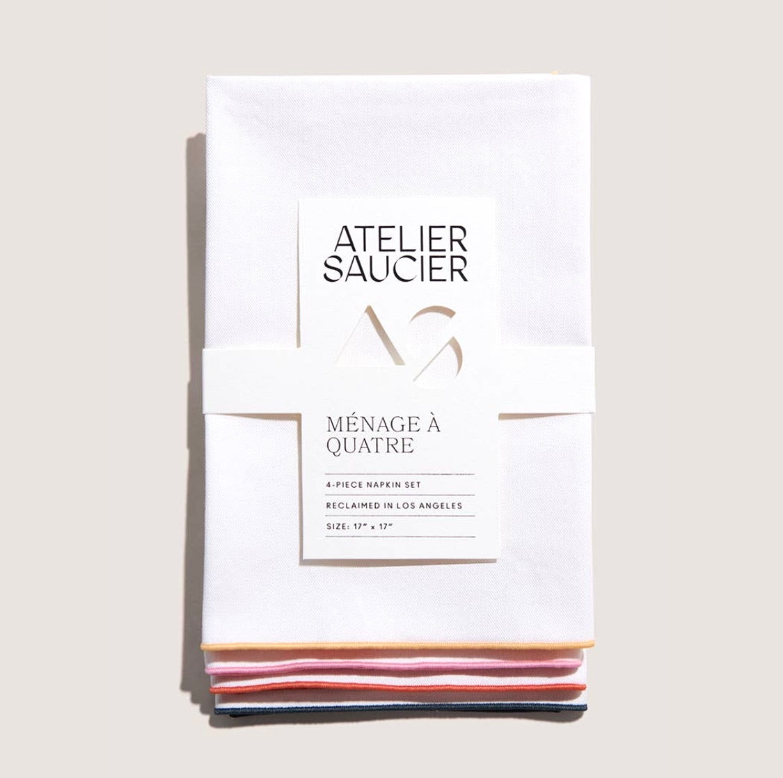 Atelier Saucier's crisp white twill is accented with colors of the rainbow. Yellow, pink, orange and green edging results in a clean, yet sunny combo. 4-piece napkin set. Made in Los Angeles. 100% premium reclaimed fabric. Dimension: 17"...Read more